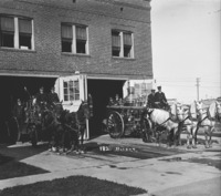 PC-2165 The Twin Falls Fire Department. Seven men pose with two horse-drawn fire cartsin front of the fire station.