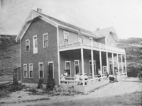 PC-2166 "Shoshone Falls Hotel;" people gathered on the front parch; bicycles resting against side of the building