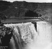 PC-2169 "Bridal Veil;" one of the three falls that make up greater Shoshone Falls. A woman stands on the dam above the Falls and two people stand o the cliff at the left.