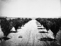 PC-2167 "An Ideal Orchard. Jas {James} Fitzgerald;" rows of trees in an orchard with a building in view.