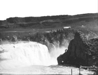 PC-2174 "Shoshone Falls;" close-up view of the Falls, with a man climbing the rocks in foreground right. The Hotel, power lines, and outbuildings can be seen on the south side.