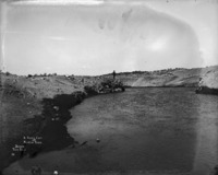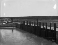 B 143 "Head Gates, North Side;" a man stands on a rock wall leading to several canal gates