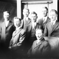 - Portrait of seven men of varying ages, all dressed in suits.