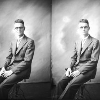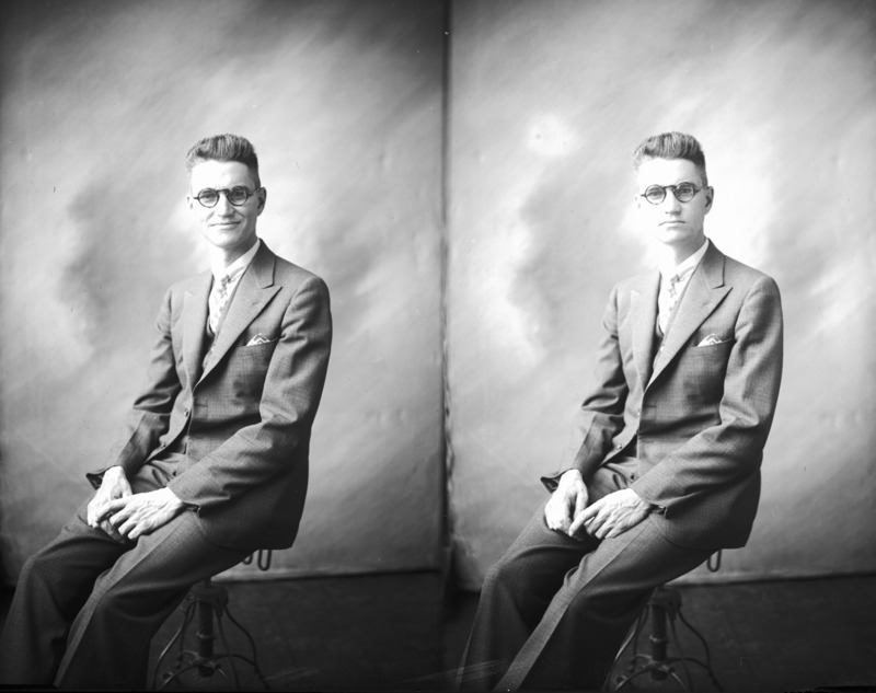 - Two portraits of a seated man in a suit.