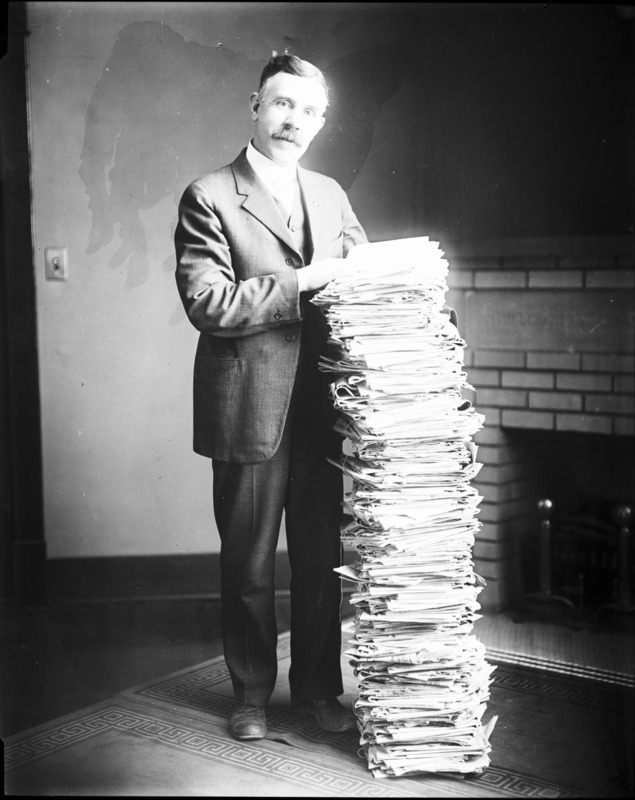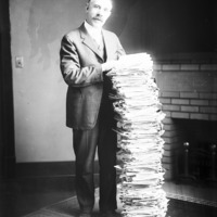 Clarence E. Bisbee standing beside a stack of newspapers and other papers, fireplace in background.