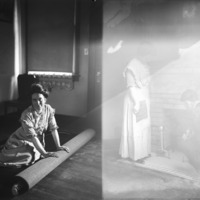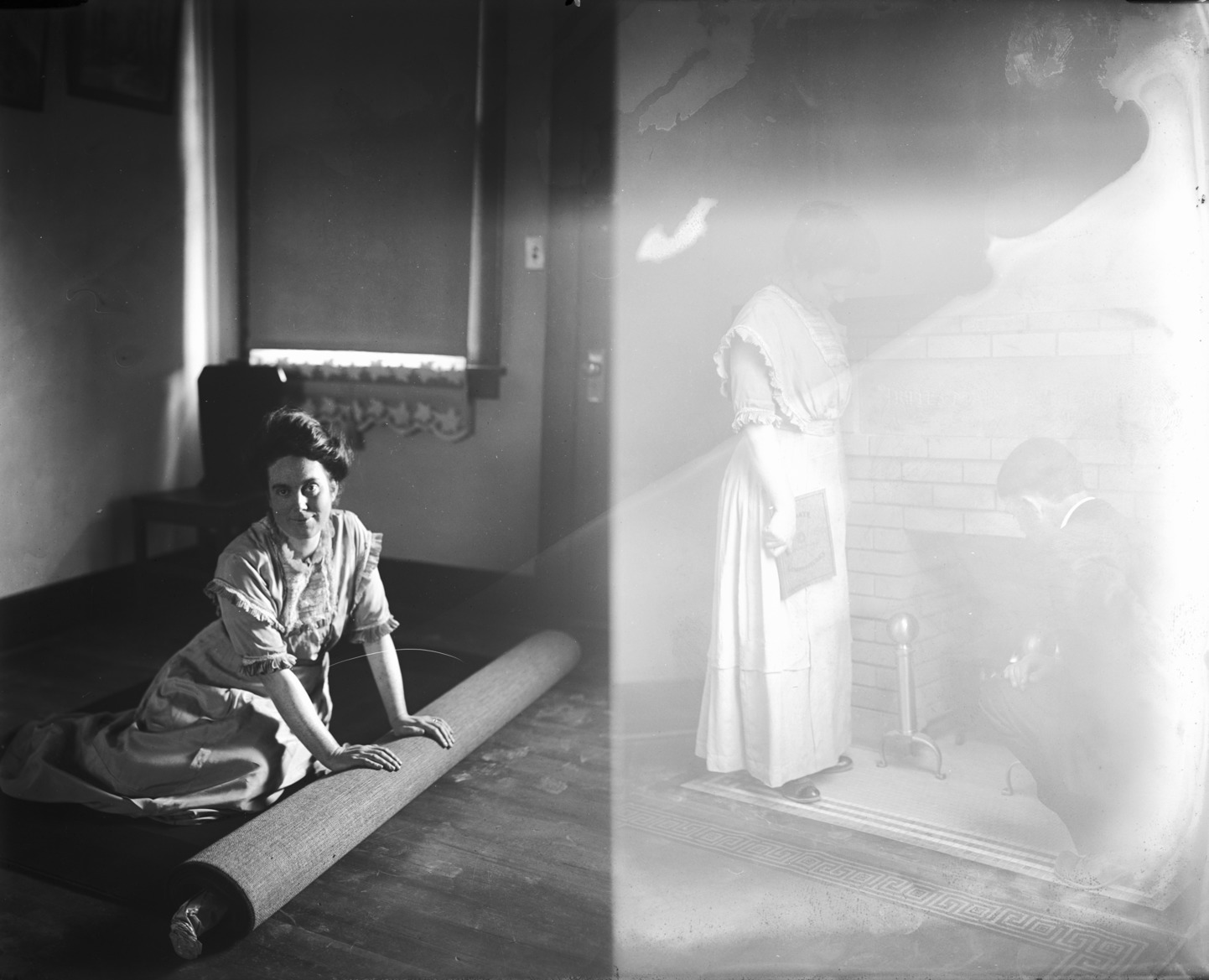 - Double exposure photo of Jessie Bisbee unrolling carpet, and both she and Clarence posing at the fireplace in the Bisbee Studio.