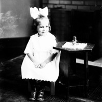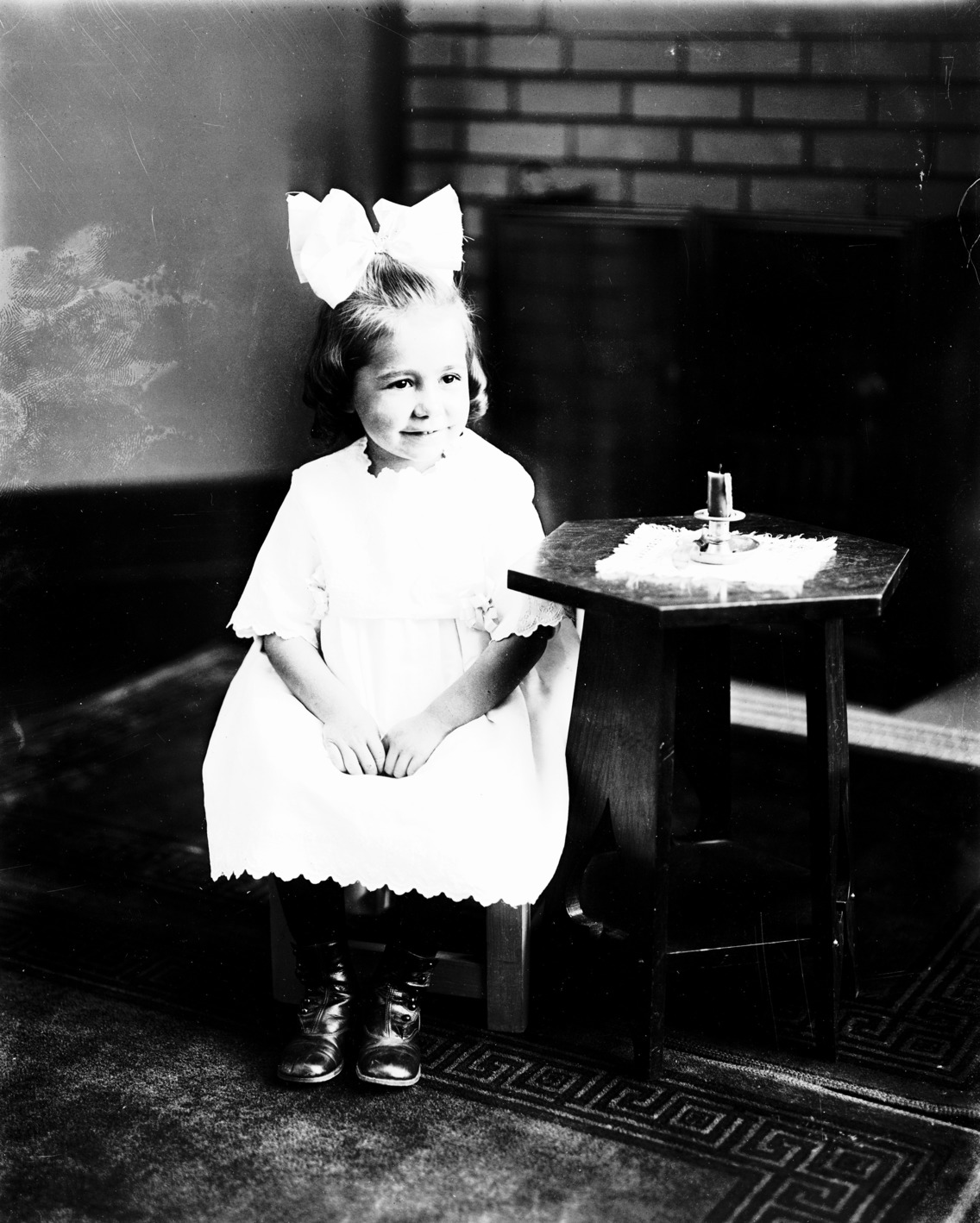 Portrait of a young girl, a big bow in her hair, seated beside a table with a candle.