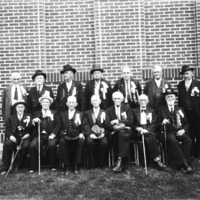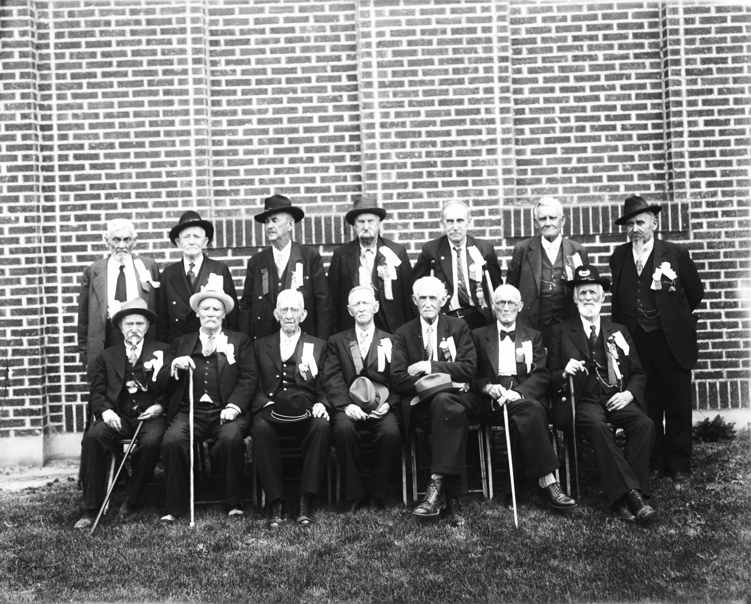 - A portrait of fourteen older men wearing ribbons. They are standing and seated in front of a brick building, most likely the American Legion building.