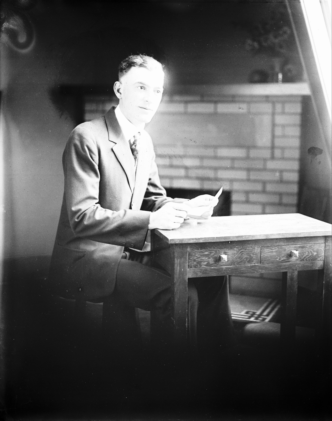 - Portrait of a young man, seated at a table with a letter in his hands.