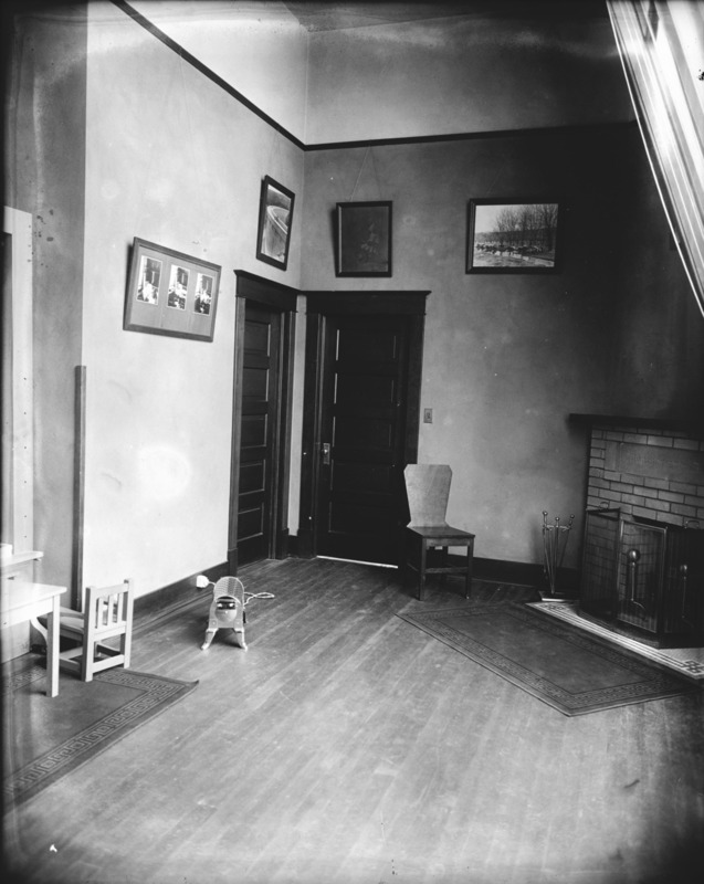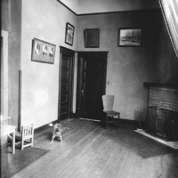 Interior of the Bisbee Studio; room with slanted window, with chairs and props.
