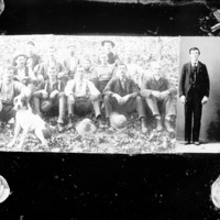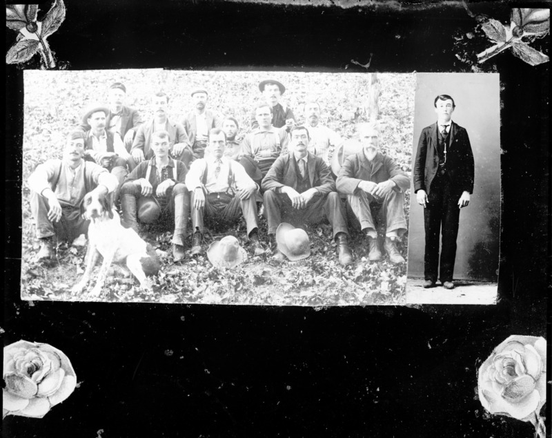 - Photo taken of two photographs. One shows a group of men seated outdoors, another with a single man standing in a studio.