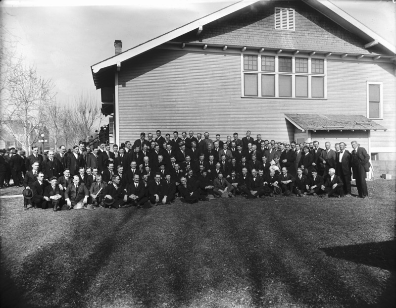 - Large group of men posed in front of the original First Christian Church. The Methodist Church can be see in the background at left.