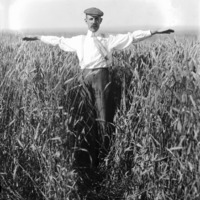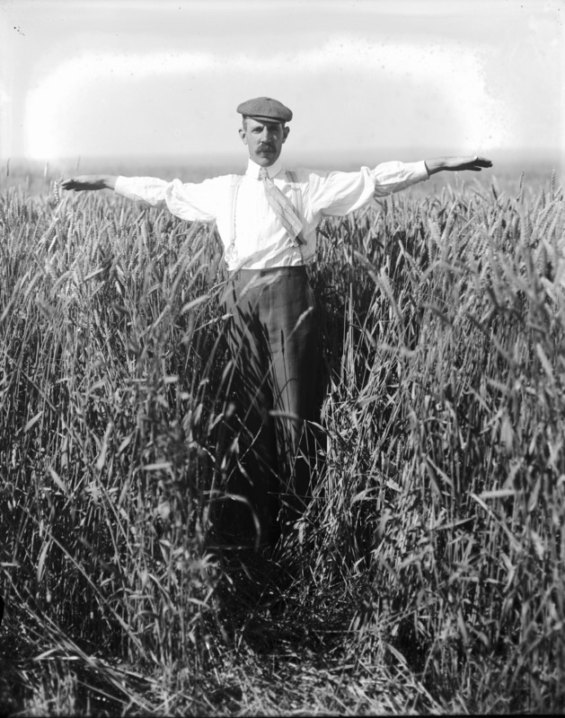 - Clarence Bisbee with arms outstretched in a field of chest-high grain.