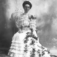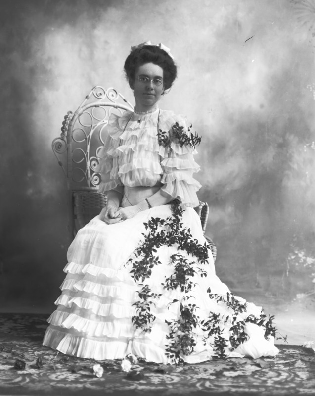 Portrait of Jessie Bisbee, seated with greenery and flowers strewn about her person.