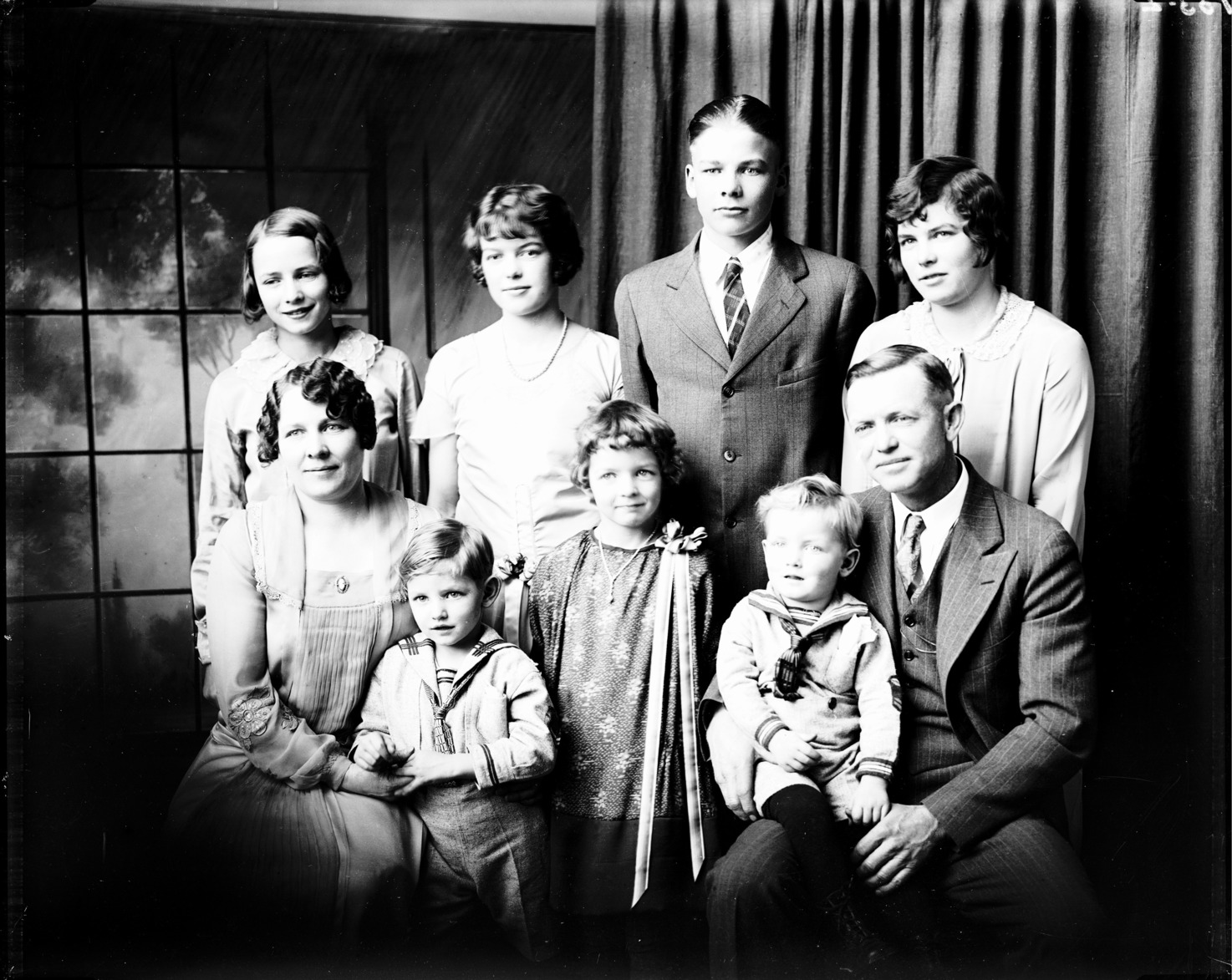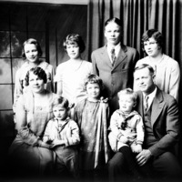 Portrait of a family with one woman, one man, three boys, and four girls.