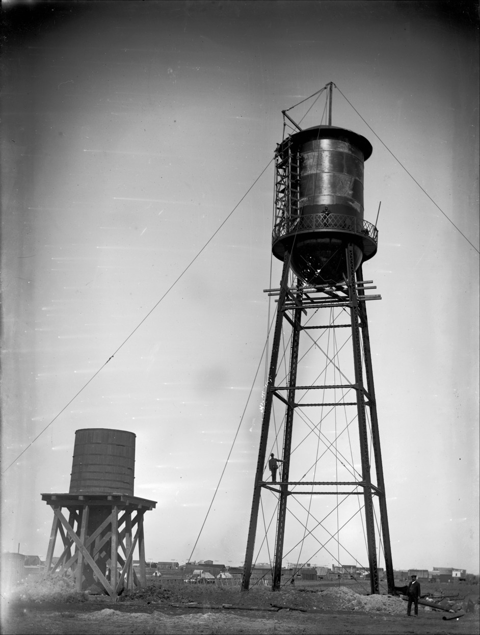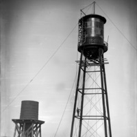- Water towers (tanks) for Twin Falls; one man stands on the structure, with one man below. Townsite buildings visible in background.
