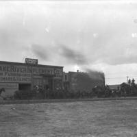 View of several buildings, with wagons, men, horses, and other farm equipment lining the street.Sign above one building reads, "Gibson's Place; Snake River Implement Co. Ltd. Farm Furnishings Hardware and Harness, Wagons Buggies and Mowers Rakes and Binders."