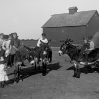 - Eight children on and by three donkeys in a barnyard; large barn in background.