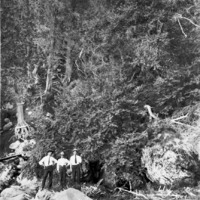 - Three men standing at the base of a steep incline covered with twisted trees.