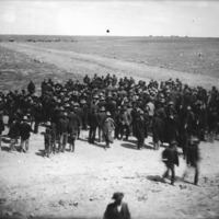 - A large group of men standing in a field; horses and/or cattle and a townsite in the distance.