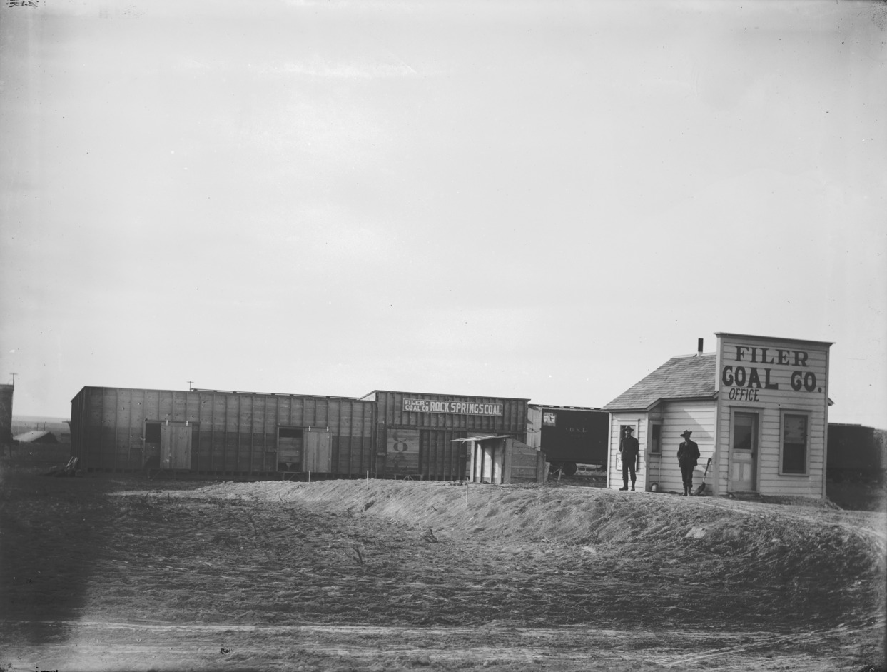 - Two men standing in front of the Filer Coal Company office; Oregon Short Line railroad cars in the background. Another sign reads, "Filer Coal Co. Rock Springs Coal.: