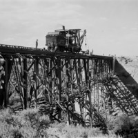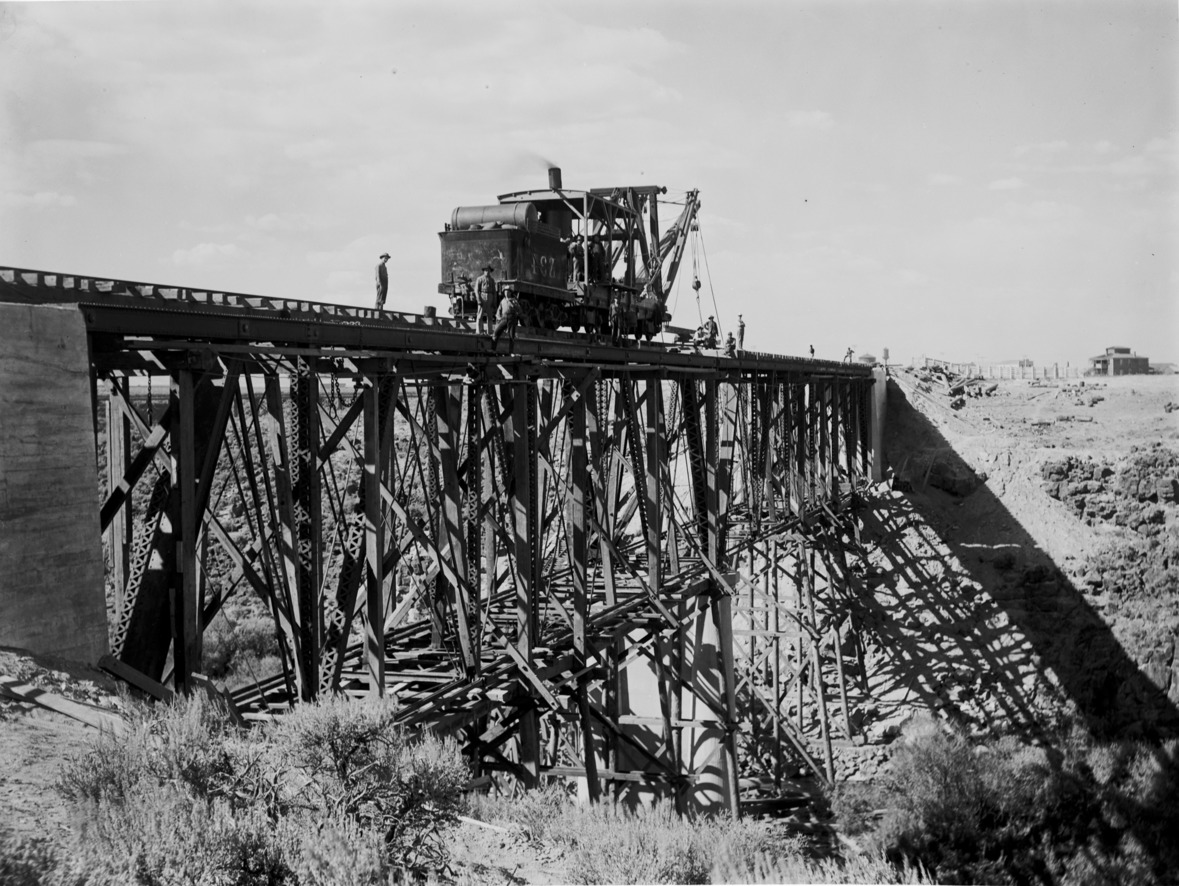 - Railroad construction crews and cars atop a bridge over Rock Creek canyon, other buildings in the distance.