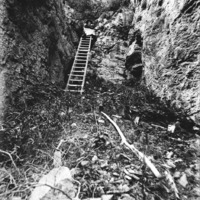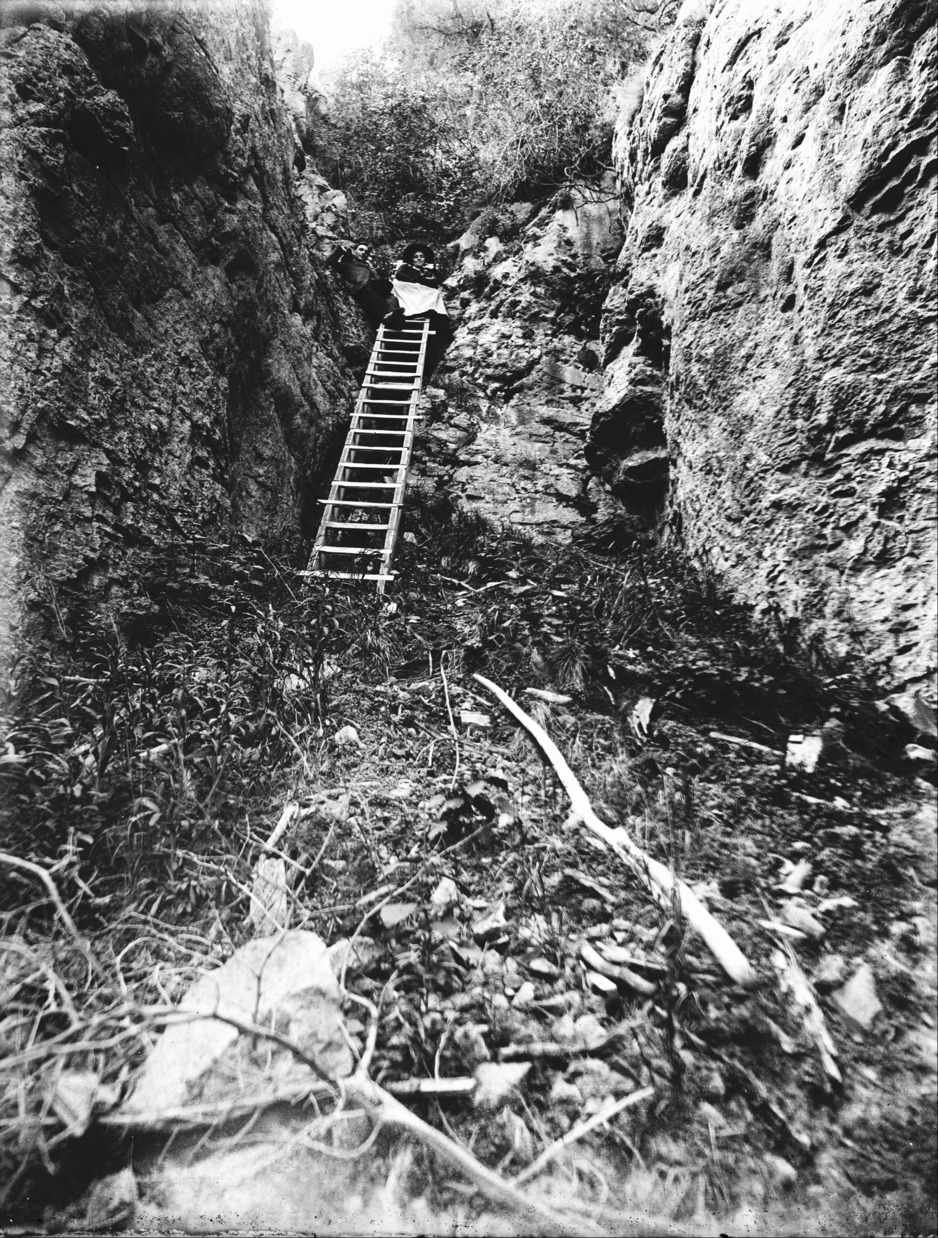- A man and a woman atop a ladder, propped against the canyon wall at Shoshone Falls.
