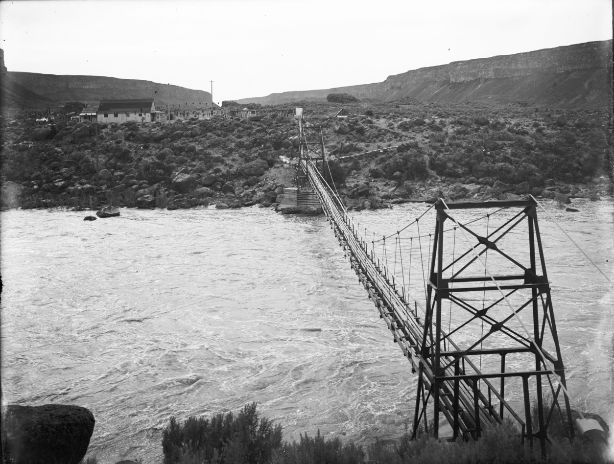 - A suspension bridge over the river near Auger Falls, near where Rock Creek joins the Snake River; buildings on the opposite bank.