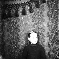 - Portrait of a boy posed before a tapestry.