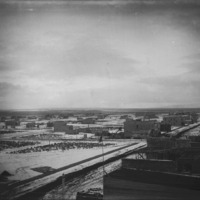 - View of early Twin Falls townsite showing streets and new construction; likely taken from atop the Hotel Perrine. Visible signs are Young's Grocery and Seed House (bottom left) and Burrington Hotel (middle right).