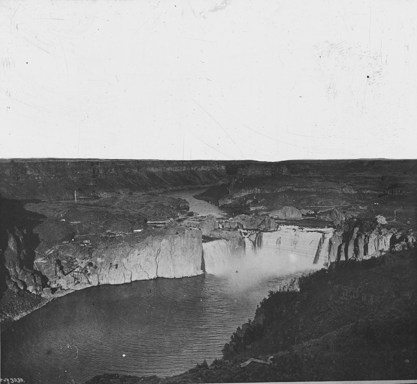 - Wide view of Shoshone Falls; Power plant on north side and Shoshone Hotel on south side of the Snake River Canyon are visible.