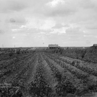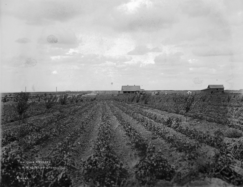 "Two Year Orchard; 1 1/2 miles north of Jerome, Idaho;" looking down rows of an irrigated field at a farmstead with house and several outbuildings