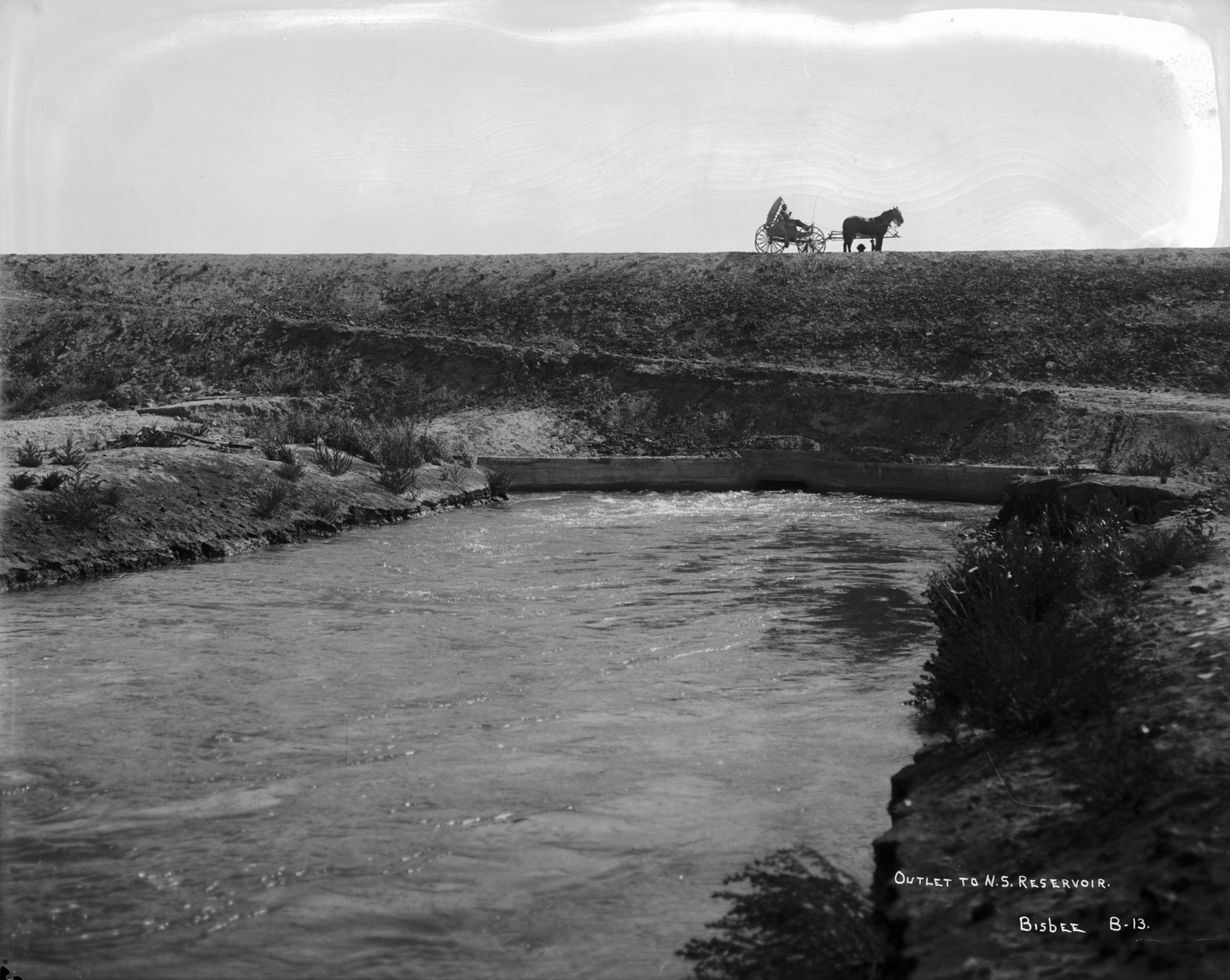 "Outlet to N. S. Reservoir;" a horse-drawn buggy on the hillside above a North Side canal.
