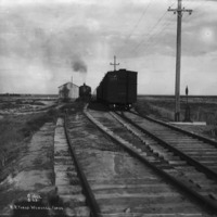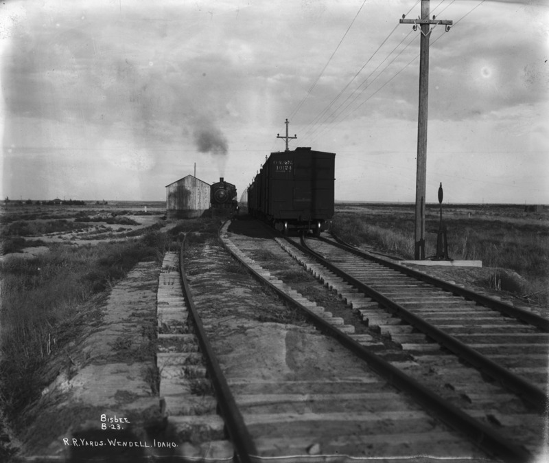 - R. R. Yards. Wendell, Idaho;" two trains pass on the railroad tracks beside a small station