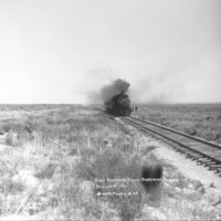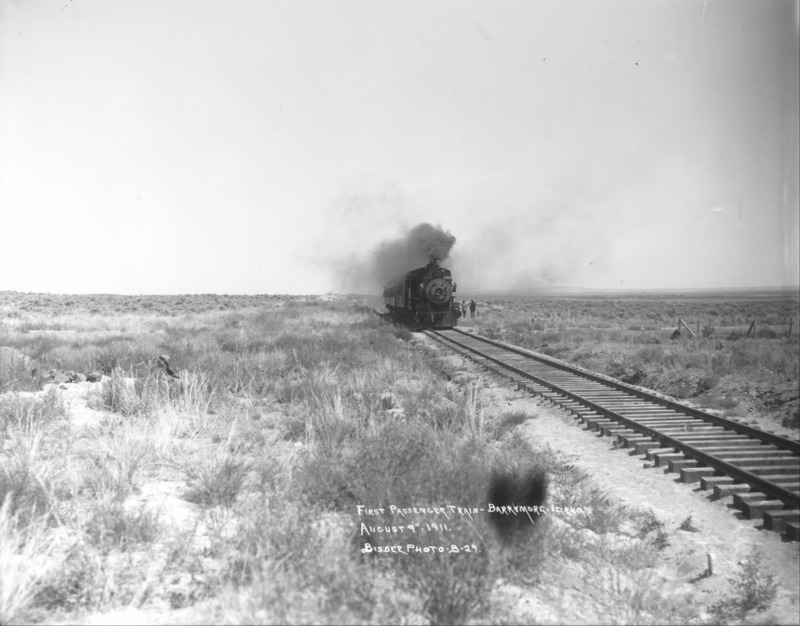 "First Passenger Train - Barrymore, Idaho. August 9, 1911;" a couple of men stand alongside the train as it sits on the railroad tracks, southeast of Jerome, Idaho.