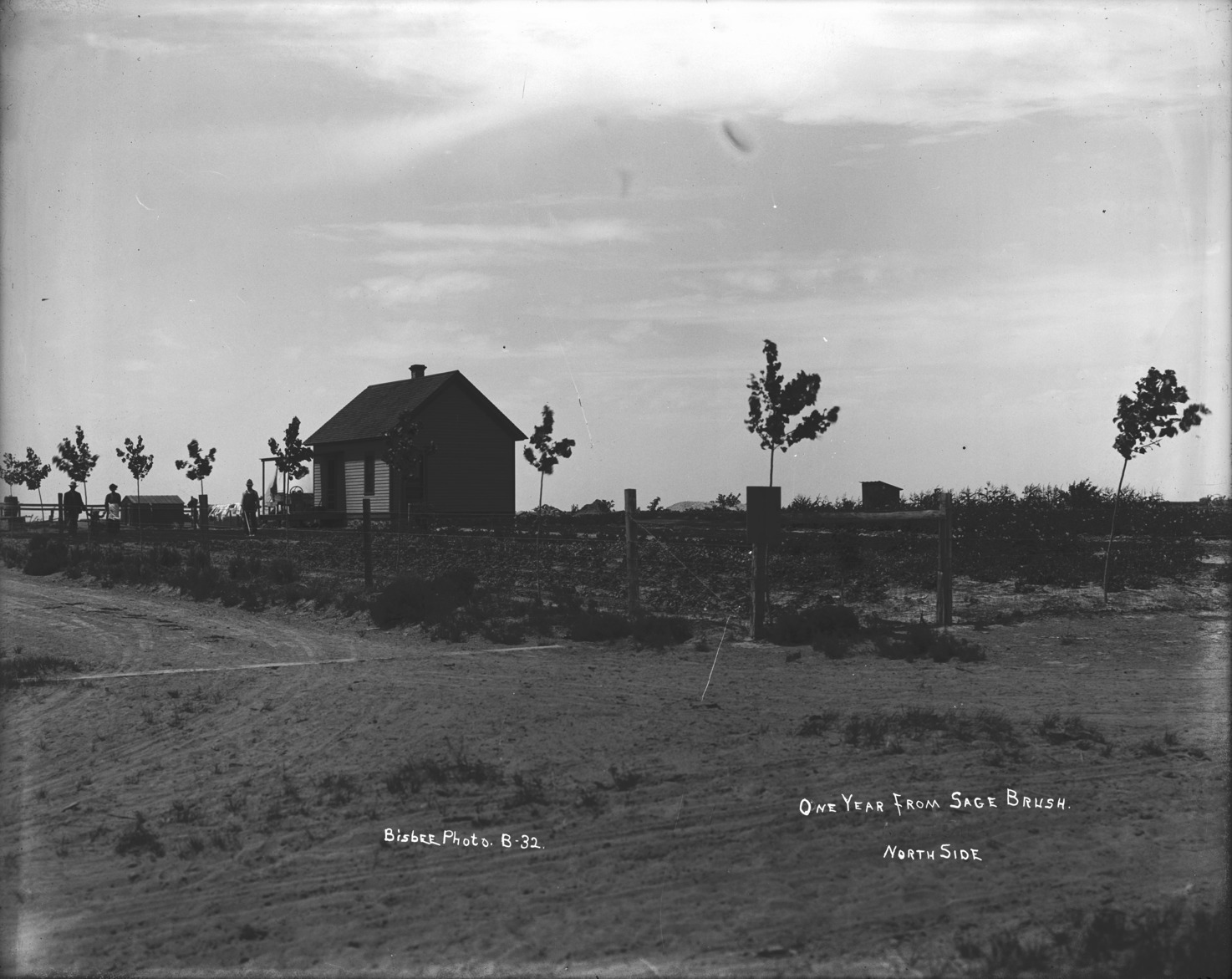 - "One Year from Sage Brush; North Side;" a farmstead with a small house, and fenced area lined with trees; four people, two men, a woman, and a child, stand in the yeard beside the house