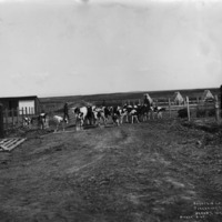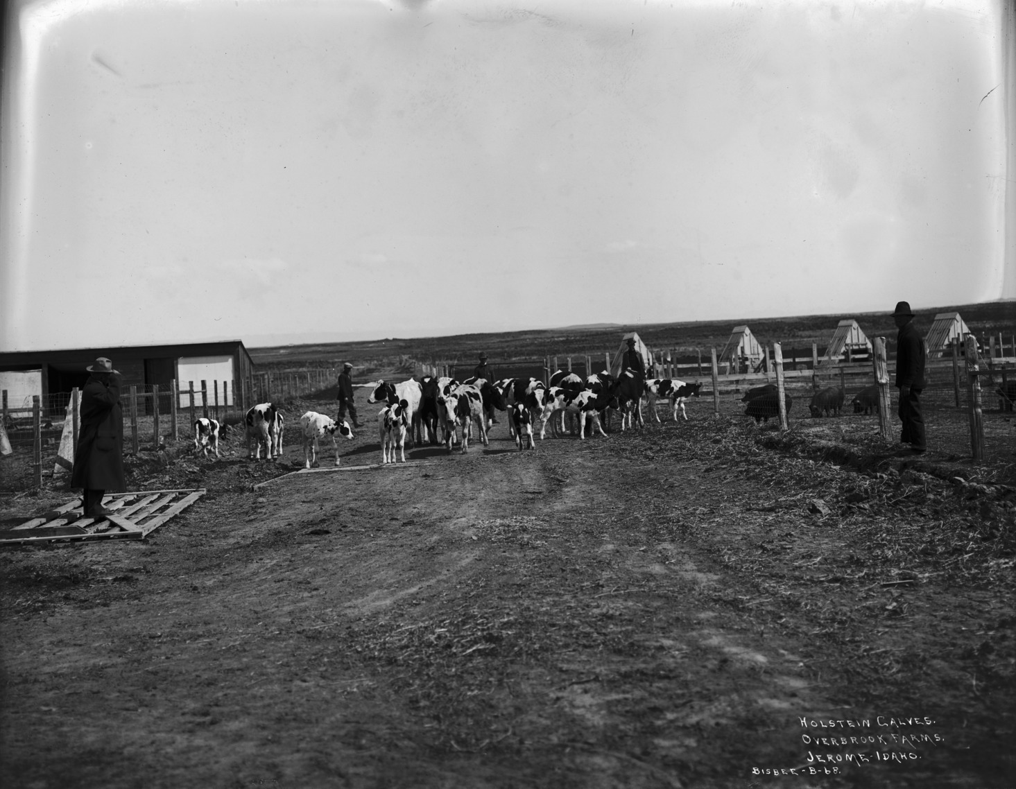 "Holstein Calves; Overbrook Farms; Jerome, Idaho;" several men stand alongside a herd of cows as they direct them down a fenced lane into a pasture. A few pigs stand in a fenced area on right.