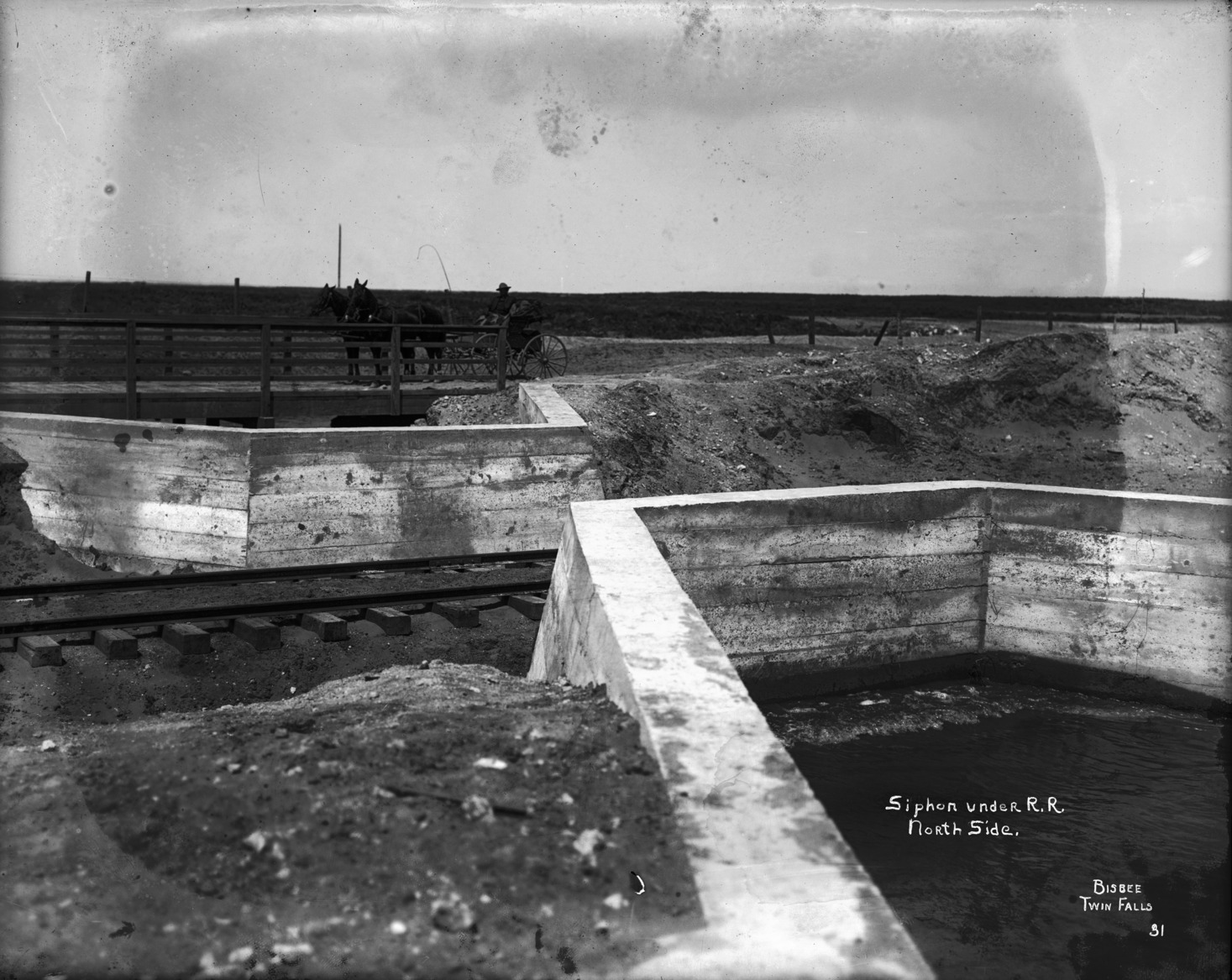 - "Siphon Under R.R., North Side;" a man in a horse-drawn buggy is parked on a lane near the siphon that goes beneath the railroad tracks.