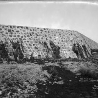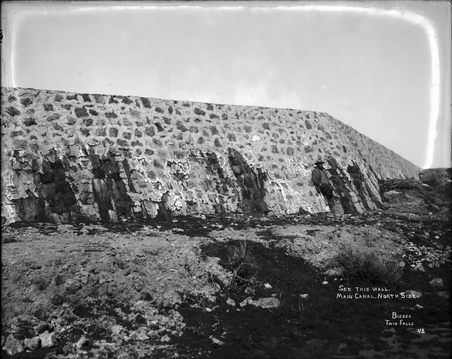 - "See this wall. Main Canal. North Side;" a man leans against the lava rock wall of the canal
