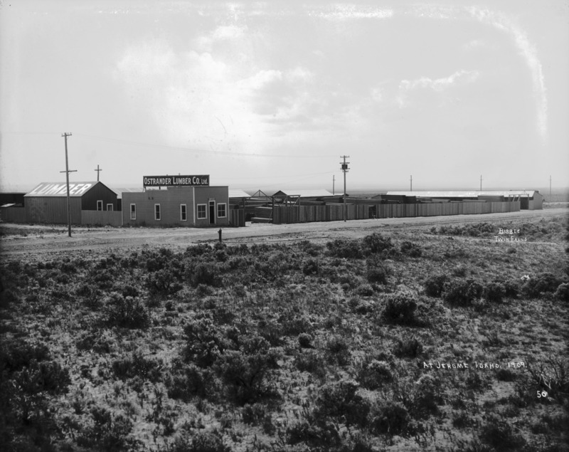 "At Jerome, Idaho, 1909;" Ostrander Lumber Company buildings and yard.