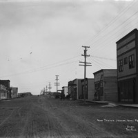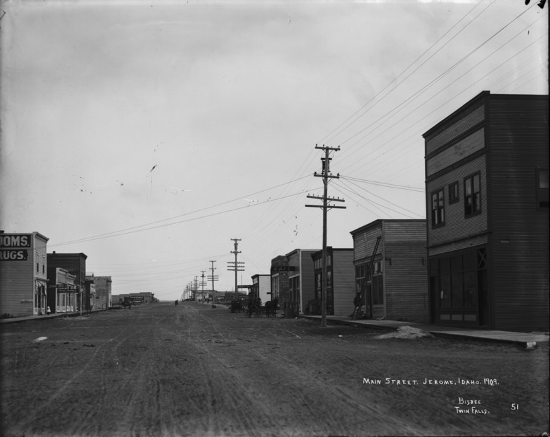 "Main Street, Jerome, Idaho, 1909;" view down the street. Visible businesses include: Jerome Drug Co; Owens and Kinney, Civil Engineers and Surveyors; Stroud-Sprague Realty Co, Ltd; Haddock Land Co; Hardwick & Co. Real Estate; and also cigar and tobacco seller and cafe.