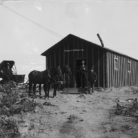 - "Grant's Hospital; North Side 1909;" a tarpaper building. A man and boy stand in front, while another man sits in a buggy driven by two horses looks on.