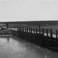 - "Head Gates, North Side;" a man stands on a rock wall leading to several canal gates