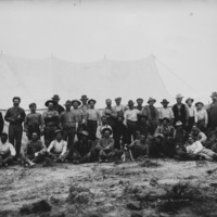 - "Ditch Builders;" dozens of men pose in front of a tent during the North Side canal project. A dog stands in front.