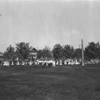 - People gather around the edges of the park near the maypoles on May Day in Twin Falls City Park. Several houses can be seen in the background.