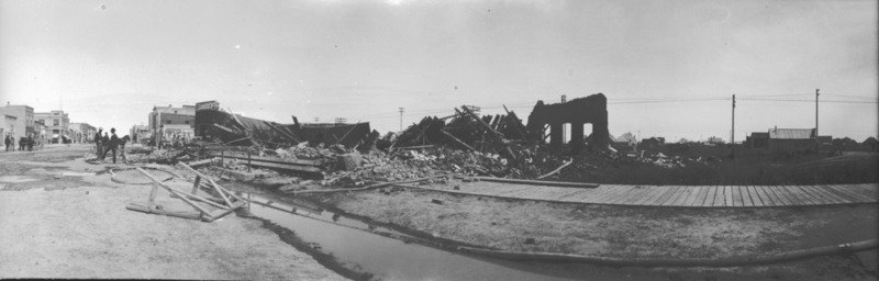 - Panoramic view looking northwest down Main Ave with the remnants of a destroyed building on the right. Other businesses and buildings visible include the Idaho Department Store, Candies.
