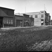 Panoramic view of Main Ave, looking northwest. A man on a horse speaks with two men standing on the wooden boardwalk Visible businesses and buildings include: The Hub; Dr. F.W. Pike; Star Restaurant; Sweeley and Sweeley; Idaho Department Store; Bedford Drug; Boyd buidling; Hotel Perrine; Eldridge's Clothing Store; Pioneer Storage and Commission Co. Two businesses in background on what is now 2nd Ave S one is Berry and Swank Plumbers and Tinners.