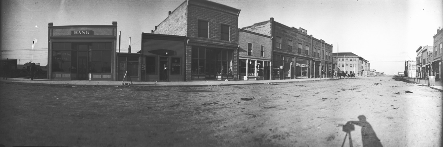 Panoramic view of Main Ave, looking south. The shadow of Clarence Bisbee and his camera can be seen near the bottom of the photo. Businesses and buildings visible include: McCornick and Co Bank; The Liberal Cigar Store, Boyd building, Perrine and Burton Merchandise; Hotel Perrine; Eldridge's Clothing Store;