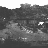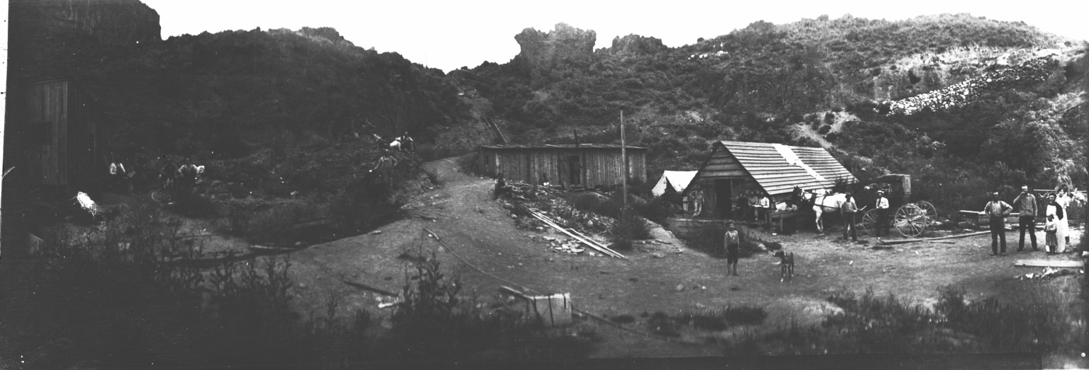 - A homestead situated alngside a canyon wall; several people pose in front of a cabin; another cabin, canvas tent, and horses and buggy are visible.
