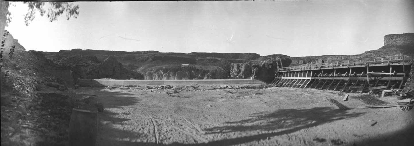 - Panoramic view above Shoshone Falls, showing the construction of the dam.